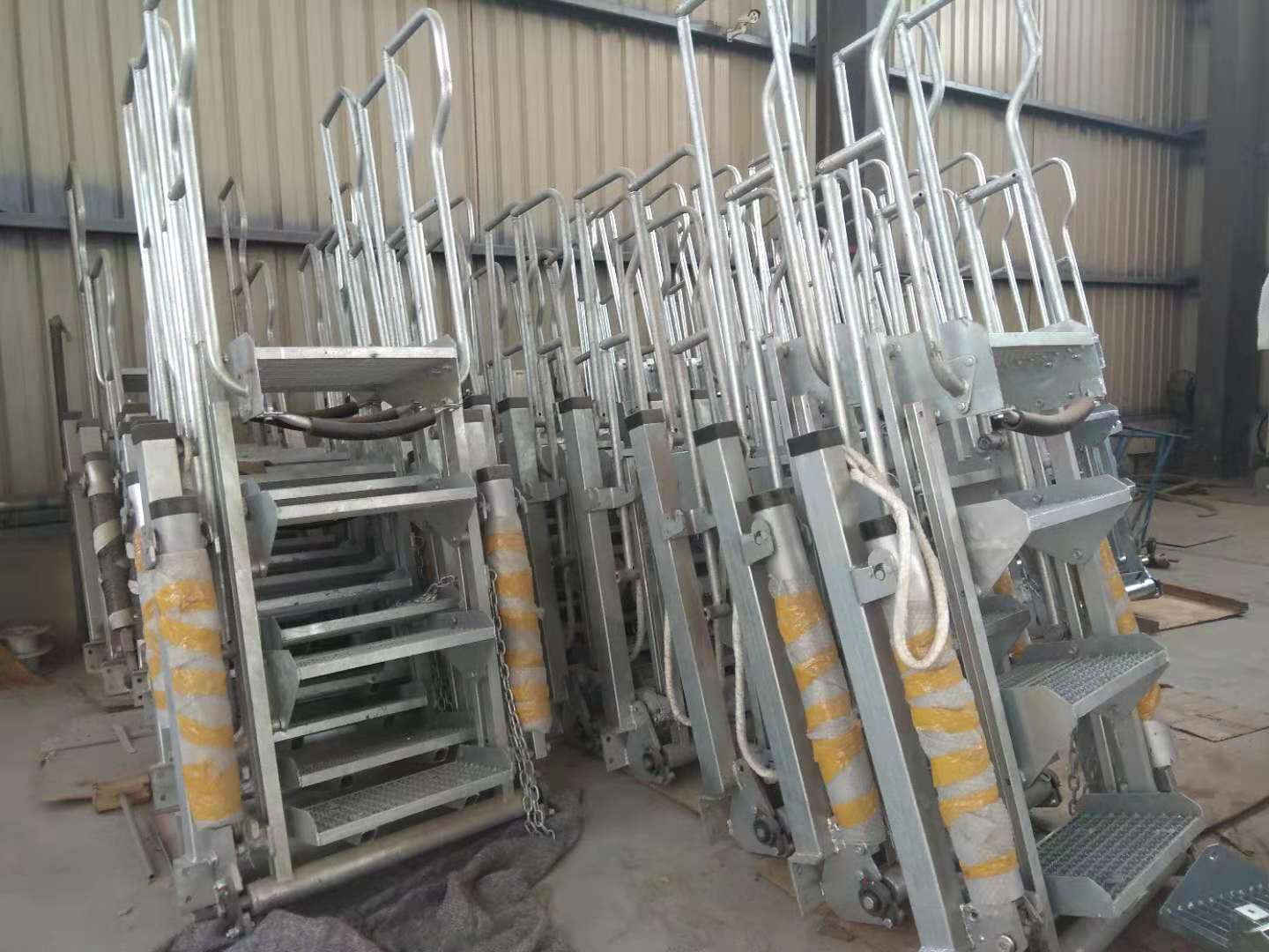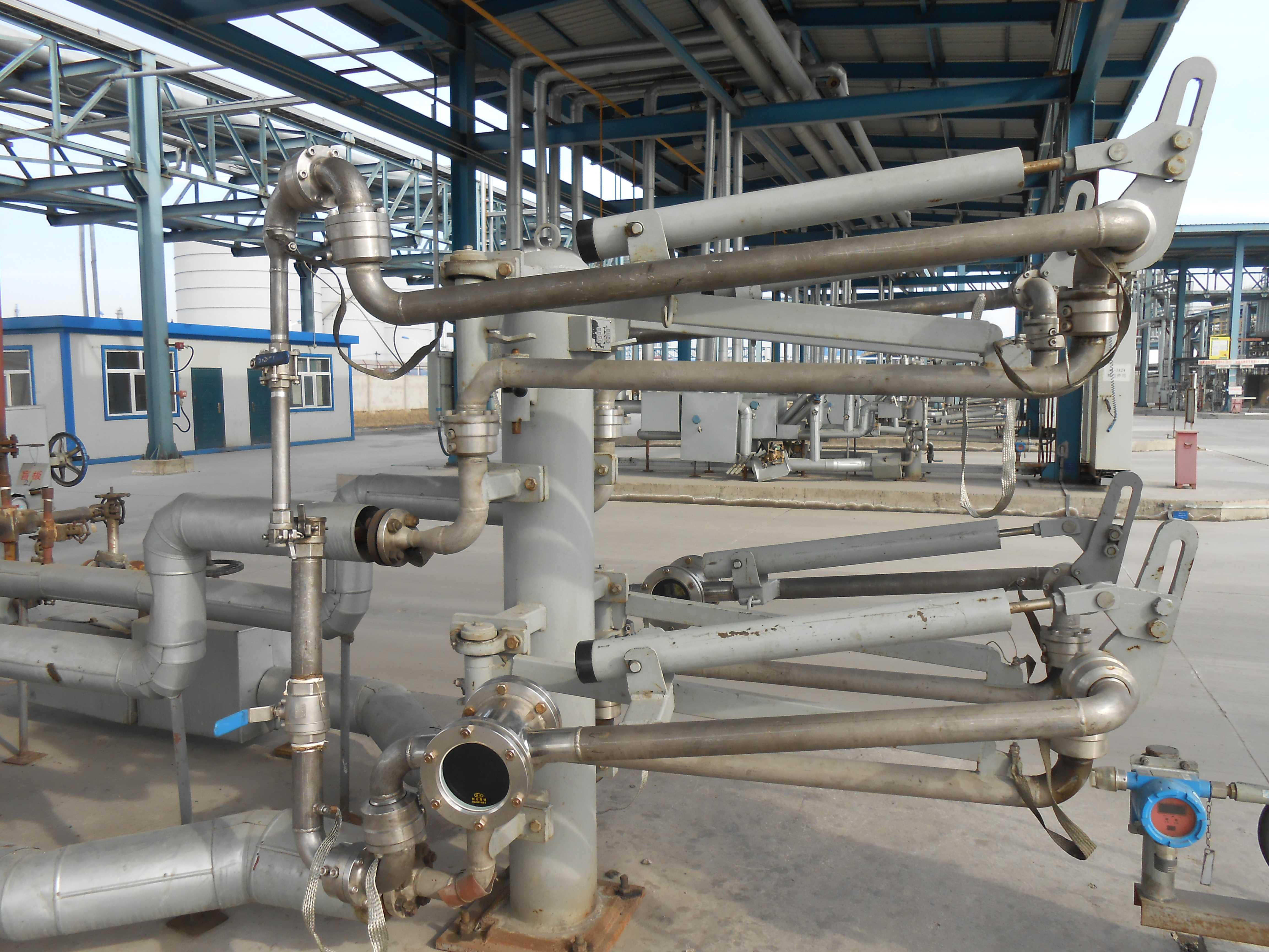 液化气底部装卸车鹤管(双管、不锈钢/碳钢);我公司设计生产的钢制活动梯延续了德国设计方案,活动梯整体结构牢固、可靠,可长时间使用而不变形,操作方便,安全可靠,踏步由锯齿形镂空方格组成,具有更高的防滑性能。设备表面采用热浸锌工艺处理,大大提高了防腐性能。